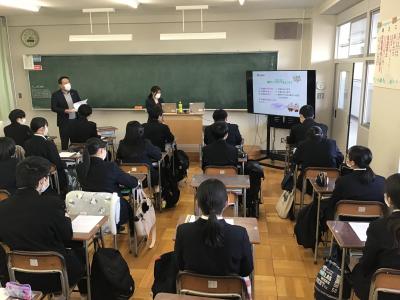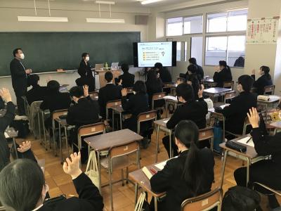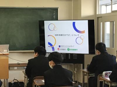 令和6年2月7日(水)LH時に、北陸銀行かほく支店 角柳様・中道様、2名にお越しいただき、高校生向け金融講座を実施していただきました。2年生の生徒たちは、早ければ2か月後には18歳成年を迎えるため、知っておかなければならない、契約についてや、必要となる責任についてわかりやすくお話を頂くことができました。生徒たちも、金融トラブルに巻き込まれないように、真剣に講座を受けていました。