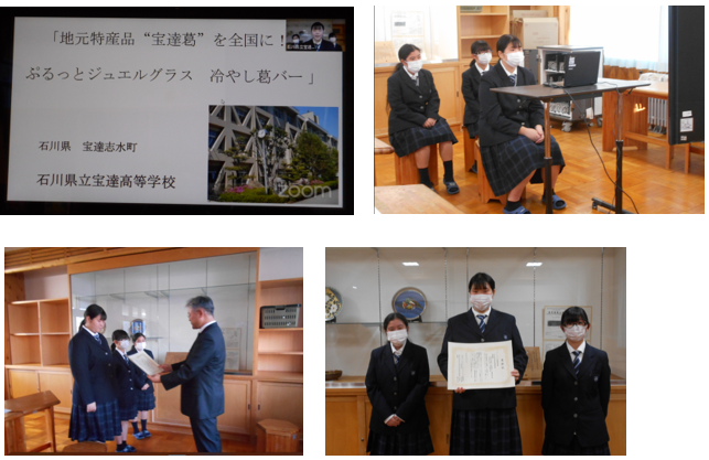 今年度初めて開催されたこのコンテストは、世界農業遺産と日本農業遺産に認定されている32地域が対象で、全国で91件の応募があったそうです。本校は、地元特産品「宝達葛」を使用した「冷やし葛バー」を他県の特産品とコラボレーションすることを想定したアイデアで応募、提案をしました。