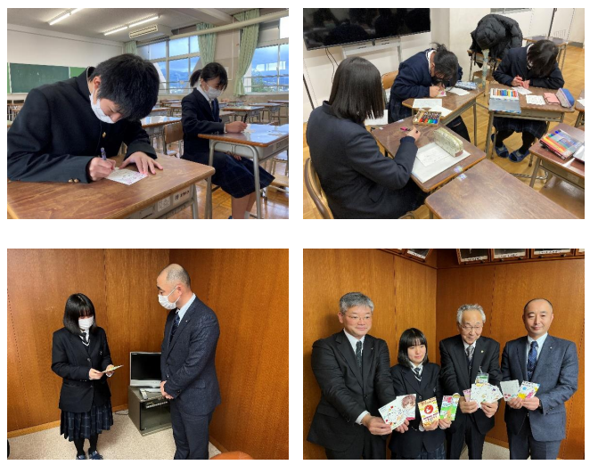 町内に住む高齢者宛てに計100枚を作成し、12月23日に宝達志水町役場を訪問し、生徒会役員の大西さんが寶達町長にお渡ししました。
