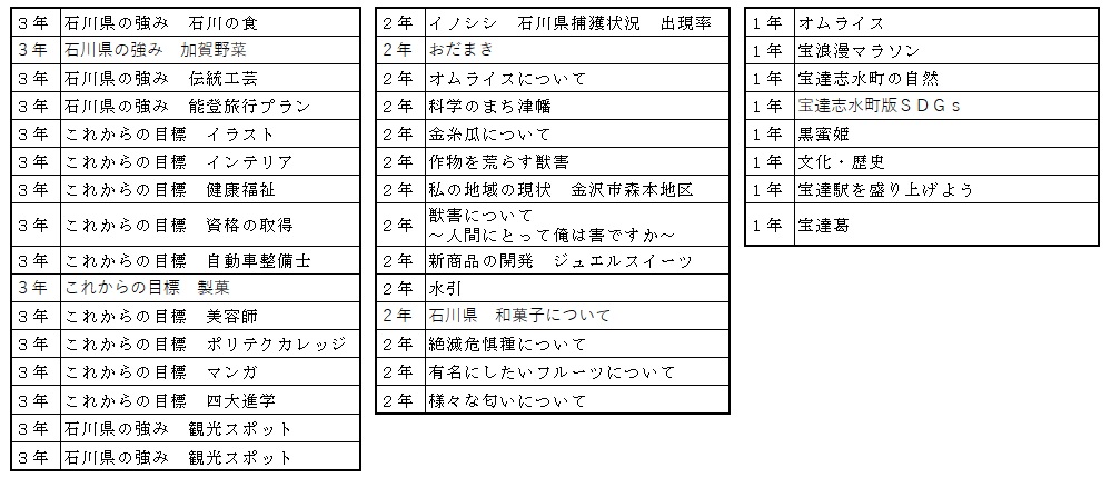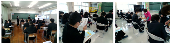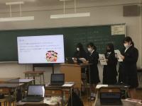 3年B・Cコース「フードデザイン」の授業において、12月12日(月)には、家庭科教員を目指す金沢大学の学生より、また、12月19日(月)には宝達志水町食生活改善推進協議会の皆さんより、より良い食生活について学びました。普段の食生活で課題となる、朝食の取り方についてのアドバイス、地産地消のよさや、フードロスをなるべく減らすために自分たちのできること、日常的に飲んでいる味噌汁の塩分濃度を測定し、塩分と健康との関わりなどについて、詳しく知ることができました。