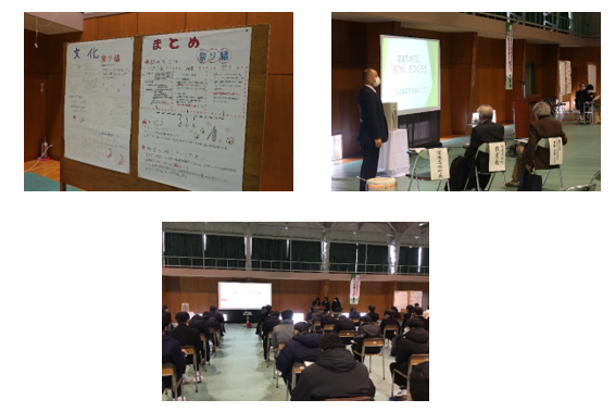 2月17日(水)に、「総合的な探究の時間」発表会が開催されました。発表会は2部制で、1部では家庭部と2年生による全体発表、2部では1年生によるポスターセッションが行われ、寶達典久町長をはじめ、多くの方が来校されました。発表会の最後に、金沢大学の宇野文夫特任教授から「皆さんが関心を持った問題の多くは、宝達志水町の問題だけではなく、日本全体が抱える問題でもあるので、ぜひ今後も取り組みを続けてほしい」との講評をいただきました。