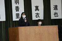 続いて在校生代表 西口 愛さんから「今年は、新型コロナウイルス感染症により学校が5月まで休校となり、総合体育大会・総合文化祭もなく、体育祭・宝高祭の日程も短縮され行われましたが、先輩方は学校の顔として下級生を引っ張ってくれました。その熱い気持ちを後輩に伝えていこうと思います。また、自分の進路実現に向けて困難な状況にあっても、先輩のように諦めることなく、日々努力したいと思います。校訓である”誠実であれ”を胸に、これから新しい道を進んでください。」という主旨の送辞、卒業生代表 前田 朱璃さんからは「在校生の皆さん。高校生活は短いです。後悔のないよう、今を大切に過ごしてください。また、周りの方々に支えられていることを忘れず、感謝の気持ちをもって、伝統を引き継いでいってください。」という主旨の答辞が述べられました。最後に三年生が選んだ式歌『3月9日(作詞作曲 藤巻 亮太)』に合わせ、ステージ上のスクリーンには在校生、職員による動画が流されました。