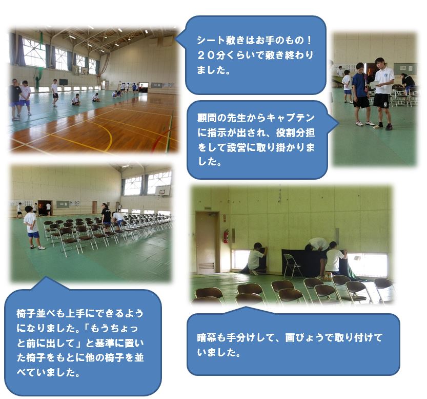 練習後に文化祭の会場準備を行いました。シートを引いたり、椅子を並べたり、暗幕を張ったりと16人という少ない人数でしたが、一人一人がテキパキと行動してくれたおかげで、1時間半くらいで準備が終わりました。学校のためにいつも準備など一生懸命してくれるバドミントン部に感謝です。