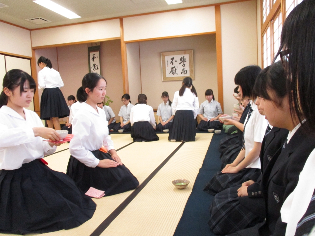 茶道部は、現在1年生2名、2年生3名、3年生7名で毎週金曜日に田畑先生をお招きして活動を行っています。日頃の活動はお点前、挨拶の仕方と礼儀作法を教わり、高文連のお茶席、文化祭のお茶席などで実演を行います