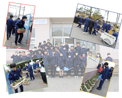 2025年3月25日 08時33分昨年11月26日(火)に1年生全員で植えたチューリップの球根が育ってきました。今日は2年生全員で、宝達駅西口(下りホーム側)正面とホームの一部に合計45鉢設置しました。町の皆さんに少しでも喜んでいただけると嬉しいです。給水の世話や駅周辺の清掃は、各部活動の生徒が分担して週に2回ほど行います。きれいな花が咲きますように。