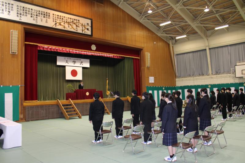 新入生31名が福岡校長先生より入学許可宣言を受け、高校生活をスタートさせました。新入生代表の宣誓に続いて、宝達志水町長 寶達典久様、PTA会長 大下雅俊様から祝辞をいただき、緊張の中にも希望に満ちた入学式となりました。