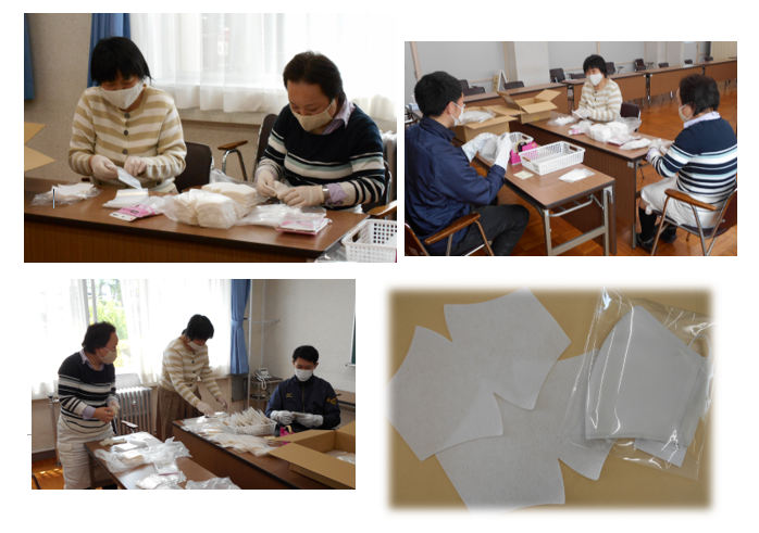 2020年5月19日 07時51分先日メールでお知らせした、石川県高等学校PTA連合会から紹介のあった「洗える布マスク、フィルター」が届きました。総務課の先生方は、手袋をつけて、フィルターを2枚ずつ袋に入れ、マスクとセットにする作業を行いました。本校PTAは、生徒に1セットずつ購入しましたので、登校する時のマスクの1枚として利用してください。文部科学省からのガーゼマスクも、学校に1枚届いていますので、それも合わせて今週の分散登校日に、生徒の皆さんに配付いたします。