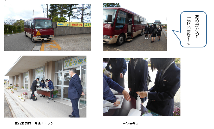 今日は、初めてスクールバスが運行されました。3年生の分散登校日で4人の生徒がスクールバスで登校しました。