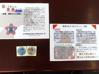 宝立小中学校9年生が,8年次に「珠洲の魅力を発信する」ことを目的にステッカーを製作しました。そして,その願いを広げるため,ステッカーとメッセージをセットにしたものを,4月の修学旅行の際,東京都庁で,ボランティア団体の方々に配布してもらうことを願って代表の方々に贈呈する機会を持ちました。その後,ボランティア団体からは何度か連絡があり,ステッカーの追加を希望していただいています。また,宝立郵便局でも趣旨をご理解いただいて,ステッカーを置かせてもらっています。たくさんの方々の協力を得ながらも,珠洲の復興に少しでも貢献できるよう生徒たちも頑張っています。