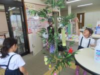 先日、郵便局から前期課程の児童に短冊をいただきました。みんなが書いた短冊を、8日(月)の2限目に、1年生が代表して届けに行きました。短冊と飾りを笹につけていくと、あっという間に七夕飾りで笹がにぎやかになりました。この七夕飾りは、来月の7日まで飾られているそうです。郵便局にお越しの際は、ぜひご覧ください。