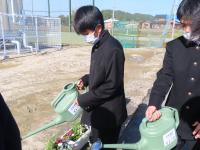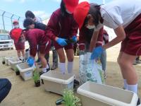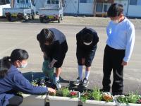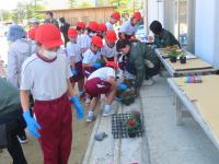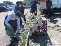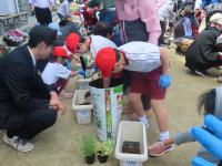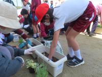 5月9日(木)、前期課程の児童を対象に、本校で避難している方々と一緒にプランターに花の苗植えをしました。これは、ホームセンターカインズさんのご提案で、プランター20個、花苗120本、培養土等を準備・提供をしていただきました。カインズさんの方々の手ほどきを受けて、ペンタスや日日草など4種類の苗を1つのプランターに6株ずつ植えました。その作業を通じて、避難者の方々と交流を深めることもできました。カインズの皆さん、このような機会を与えていただき、ありがとうございました。大切に育てたいと思います。