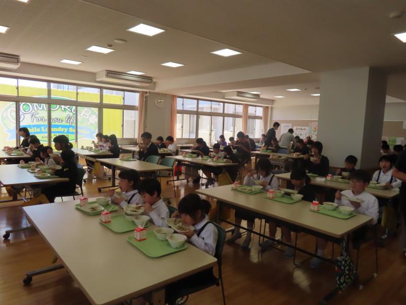 5月10日(金)の給食の様子です。給食が本格的に始まって1か月が経ちました。ランチルームで全員が一方向を向いて、黙食しています。しっかりと食器をもち、できるだけ残さず食べるようにしています。常に感謝の気持ちをもって「いただきます」「ごちそうさま」もしています。とてもおいしい給食を味わって食べています。