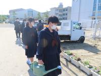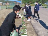 先日、ホームセンターのカインズさんからいただいた花の水やりを始めています。平日は本校の児童生徒が水やり当番で、休日は仮設住宅の方々が当番で行っています。晴れた朝には、学年ごとで決めた曜日にその学年全員が水やりをしています。13日(月)は雨のため、3・4年生の水やりはできませんでしたが、14日(火)は5年生が、15日(水)は7年生が、しっかり水やりをしました。担任や副担任の先生方も朝早めに来て、準備をし、児童生徒を出迎えて、アドバイスしたり、労いの言葉をかけたりしてくれています。児童生徒にとっては、当番の日は少し早めの登校になりますが、これも保護者の方のご理解とご協力があってこそです。心より感謝いたします。