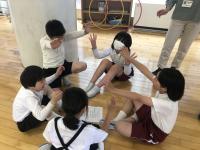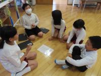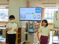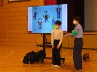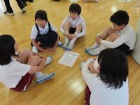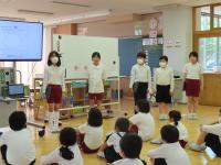 6月4日(火)昼休みの時間に、前期課程の児童が『なかよし集会』を開きました。5年生が集会の進行をし、①「相手を知る」活動と②「缶バッジ」のデザイン募集についての説明がありました。①では、10項目お題のある用紙を各グループに配り、アド・ジャンケンをして、その番号のお題について話し合うという活動でした。話し合いからお互いを知ることで、いじめ予防につなげる取組でした。