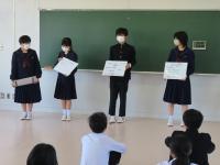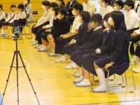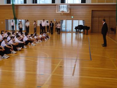 次に「花の水やり」について話されました。みんなの協力で、毎朝プランターの花の水やりをしていることに感謝の意を述べられ、「花を大切にする人は、人を大切にすることができるのです」とおっしゃいました。児童生徒もうなずきながら、しっかりと話を聴くことができました。