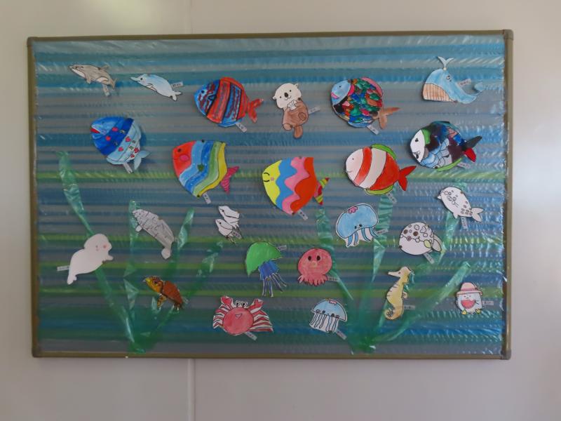 お知らせが遅れて大変申し訳ありませんが、前期課程児童が作製した作品が玄関前に掲示されましたので、紹介します。夏らしいいい感じの作品です。作製した児童の皆さん、指導された担当の先生、ありがとうございました。毎朝、このアートを目にして、気持ちの良いスタートが切れています!