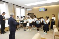 7月17日木)、児童会の代表児童2名が、校長先生を訪れ、缶バッジの贈呈を行いました。すてきなデザインに仕上がりました。ありがとうございました。今後の集会には、胸にしっかりとつけて、参加していきましょう。