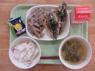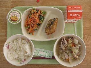 白ごはん サバの竜田揚げ 人参シリシリ さつま汁 梨ゼリー 牛乳