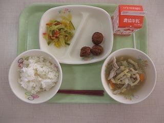 白ごはん ミーボールの甘酢あん 野菜のカレー炒め 豚汁 牛乳