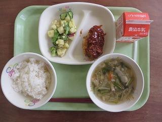 白ごはん ハンバーグトマトソース サラダ コンソメスープ 牛乳