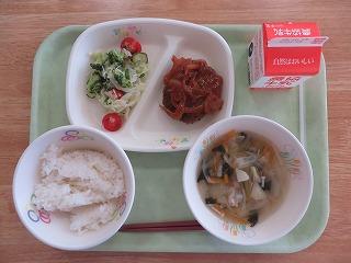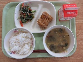 白ごはん 白ごまチキン いそかあえ 里芋のみそ汁 牛乳