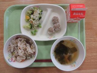 混ぜご飯 ポークシューマイ 柿サラダ みそ汁 牛乳