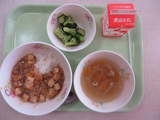 麻婆丼 野菜の昆布和え 中華スープ 牛乳