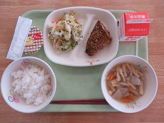 白ごはん 鯖の胡麻みそ焼き キャベツの甘酢あえ みそ汁 豆乳プリン 牛乳