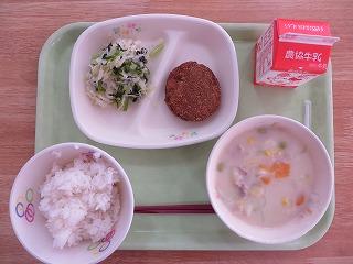 白ごはん メンチカツ グリーンサラダ クリームシチュー 牛乳