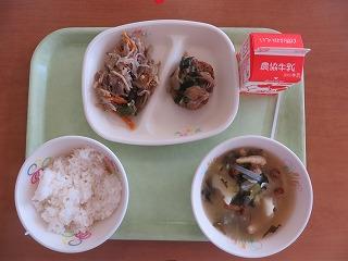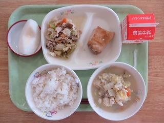 白ごはん 鶏肉の照り焼き 野菜炒め みそけんちん汁 梨 牛乳