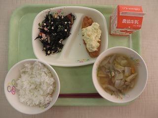 白ごはん ホキフライタルタルソース ひじきのマリネ 田舎汁 牛乳