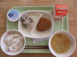 白ごはん かぼちゃひきにくフライ 白和え みそ汁 ゼリー 牛乳