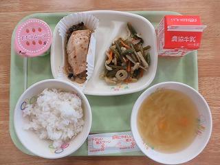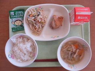 白ごはん 鶏肉の照り焼き 焼きビーフン 田舎汁 のりふりかけ 牛乳