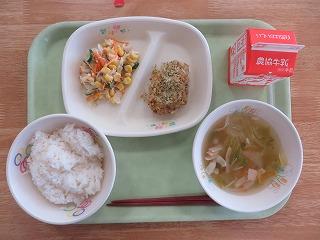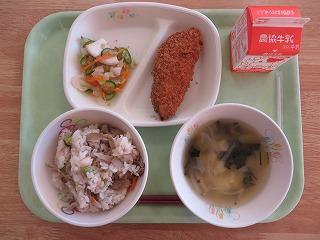 秋の香りご飯 サーモンチーズフライ うめ和え みそ汁 牛乳
