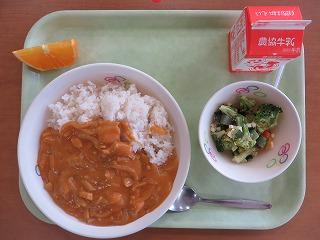 バターチキンカレー ブロッコリーのカラフルサラダ オレンジ 牛乳
