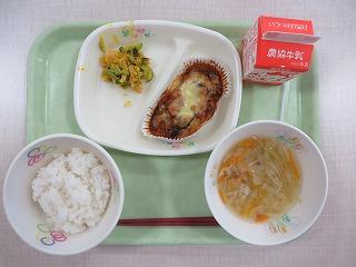白ごはん なすのミートグラタン パンプキンサラダ コンソメスープ 牛乳
