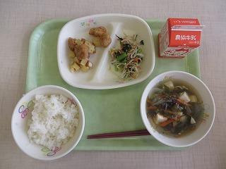 白ごはん 鶏肉とじゃがいもの揚げ煮 もやしの中華和え もずくスープ 牛乳
