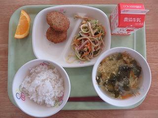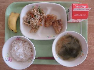 白ごはん チキンのオーブン焼き 千草和え みそ汁 オレンジ 牛乳