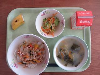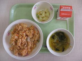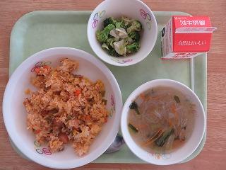 ジャンバラヤ ブロッコリーのおかかあえ 中華スープ 牛乳