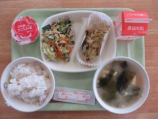 白ごはん シューマイ 野菜炒め チンゲン菜の卵スープ 牛乳