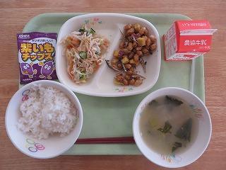 白ごはん 大豆とさつまいものごまがらめ カミカミサラダ みそ汁 チップス 牛乳