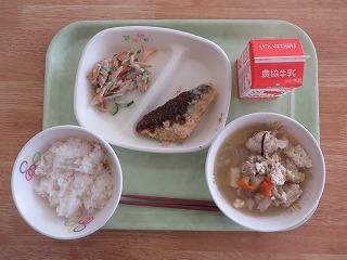 白ごはん さばのごまみそだれ ごぼうサラダ けんちん風汁 牛乳