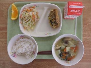 白ごはん サバのカレー揚げ サラダ みそ汁 オレンジ 牛乳