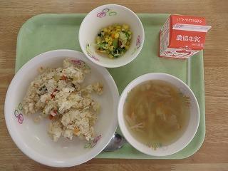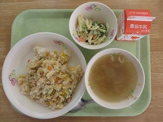 白ごはん 鮭チャーハン マカロニサラダ コンソメスープ 牛乳