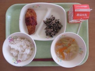 白ごはん 魚フライ きゅうりとゴボウのサラダ コンソメスープ 牛乳