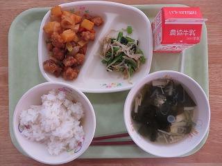 白ごはん 酢豚 もやしと小松菜のあえもの 中華スープ 牛乳