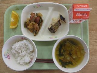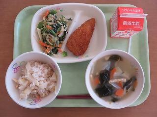 たけのこごはん サーモンチーズフライ ごまあえ みそ汁 牛乳