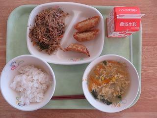 白ごはん 揚げぎょうざ 麻婆春雨 かきたまコーンスープ 牛乳
