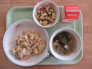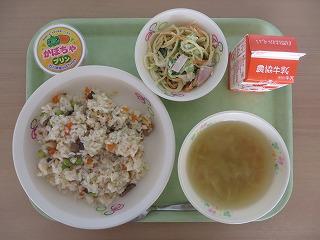 チキンライス スパゲティサラダ コンソメスープ かぼちゃプリン 牛乳