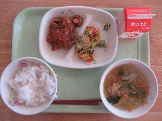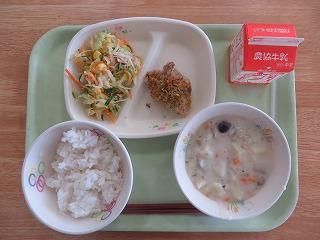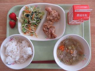 白ごはん 鶏肉のたつたあげ きゃべつの甘酢あえ さつま汁 いちご 牛乳